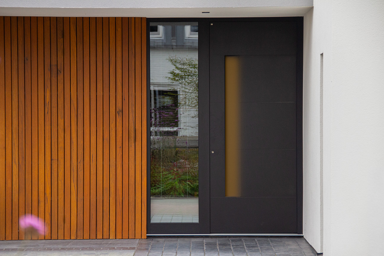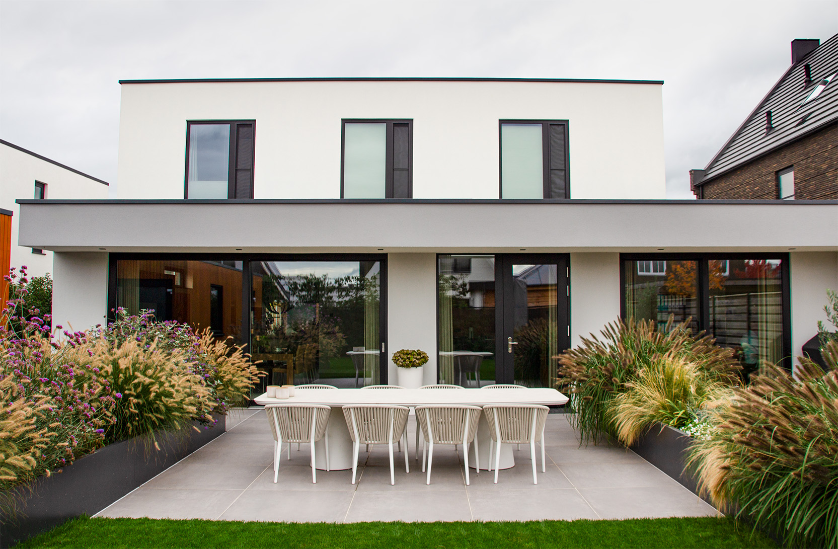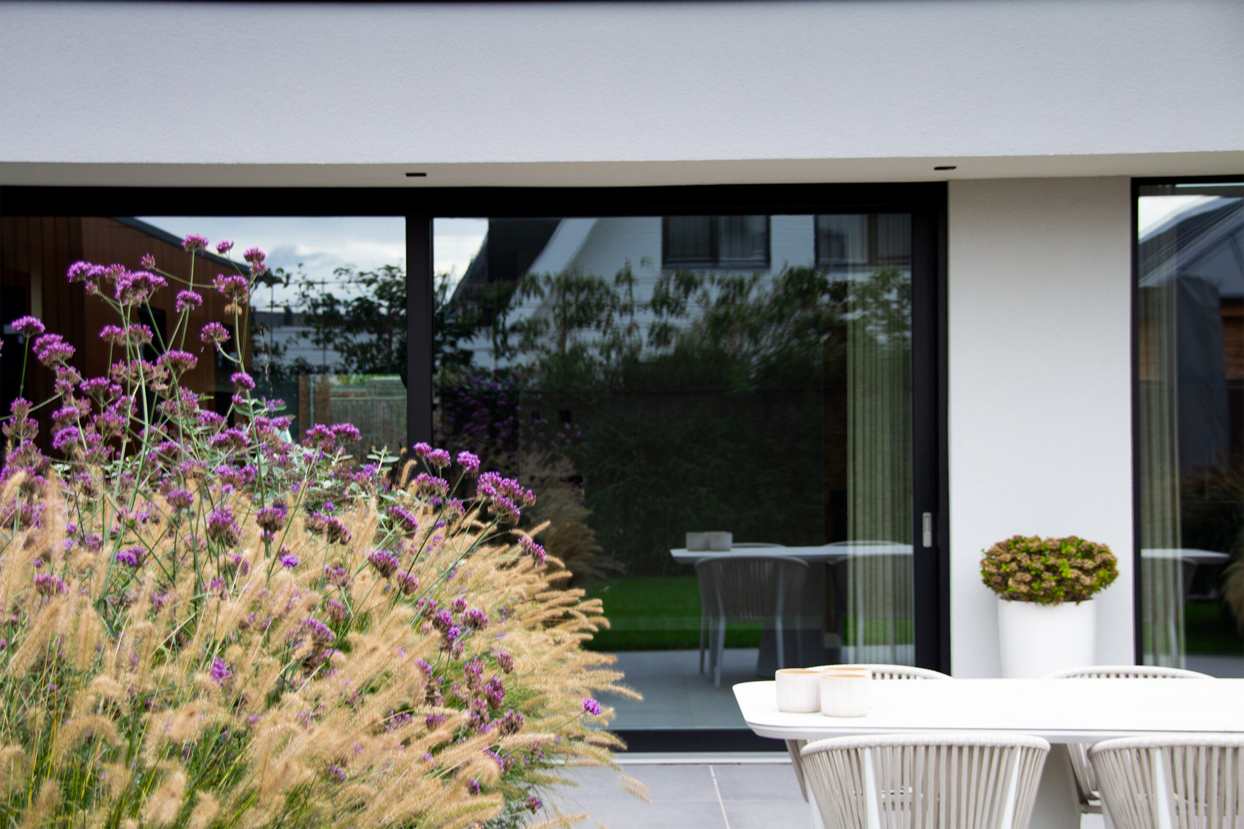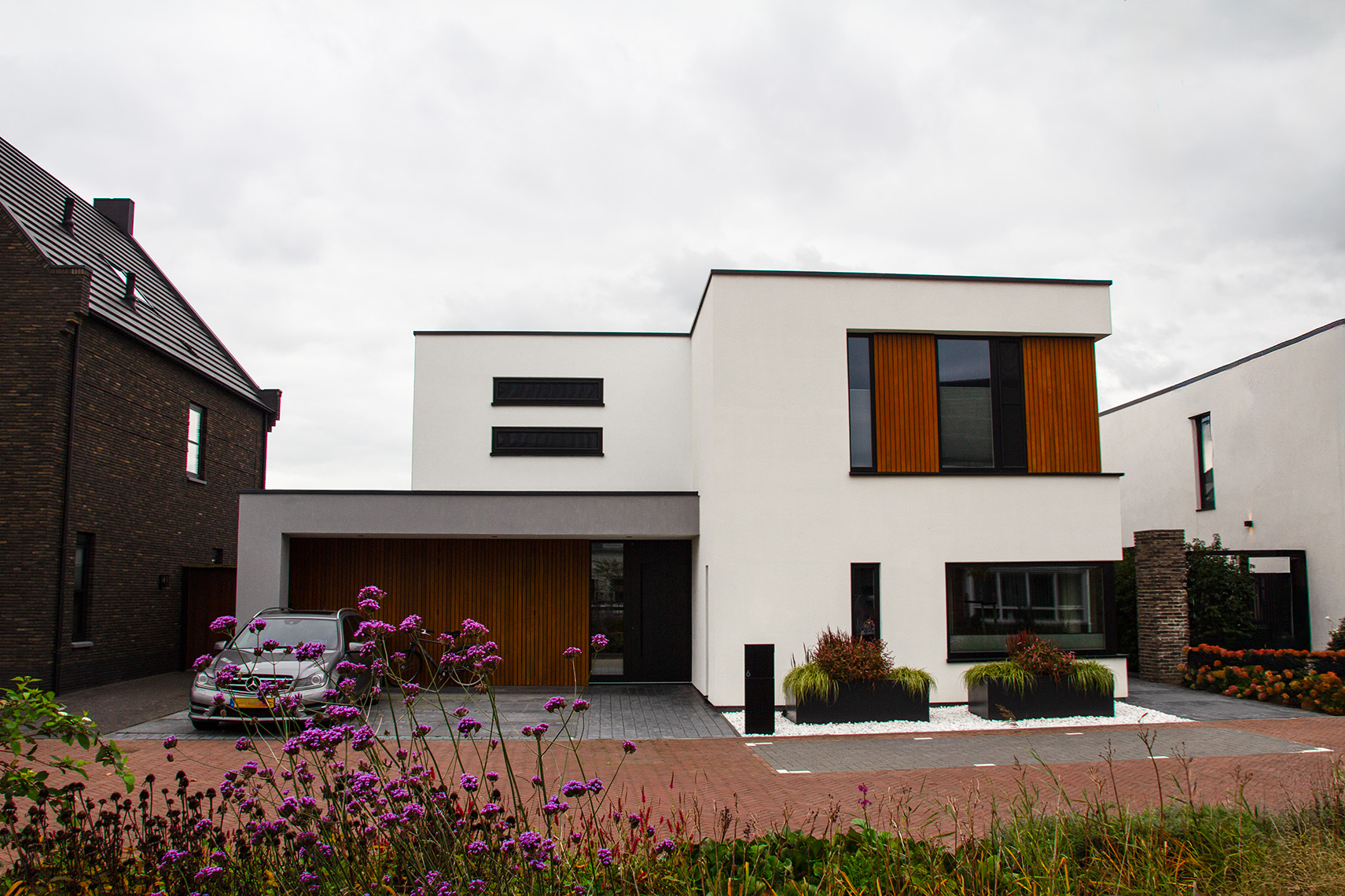 | Bijzonderheden | Bij dit woonhuis hebben wij onze Hout-Aluminium kozijnen, schuifpuien en deuren mogen plaatsen. Geheel uitgevoerd in triple glas. De voordeur is voorzien van een geïntegreerde greep met ledverlichting. |